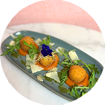 Boulettes de riz italiennes panées, garnies de saumon et courgettes, servies avec un coulis de tomate et basilic.