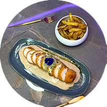 Poulet croustillant à l'italienne, servi avec des frites maison et une onctueuse sauce forestière.