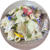 Pâtes rigatoni enrobés d'une onctueuse sauce à la truffe noire.